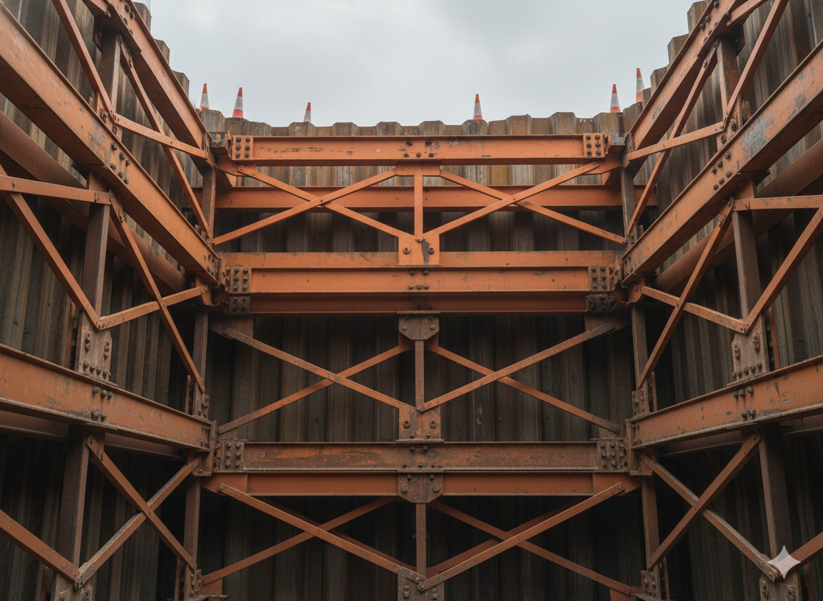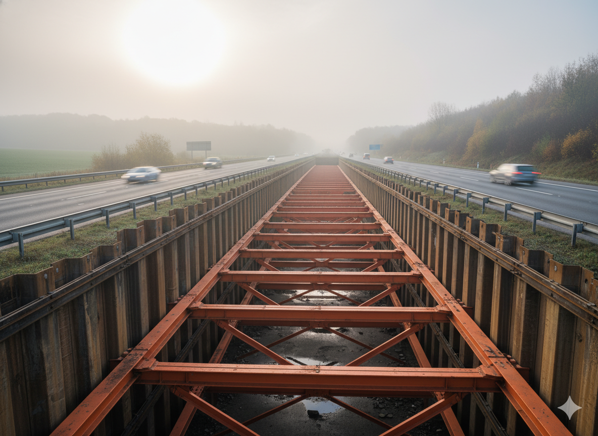 Выполнили шпунтовое ограждение котлованов вдоль действующей магистрали и смонтировали распорные рамы под временные технологические выемки. Работы вели поэтапно с сохранением транспортной логистики и геодезическим контролем деформаций.